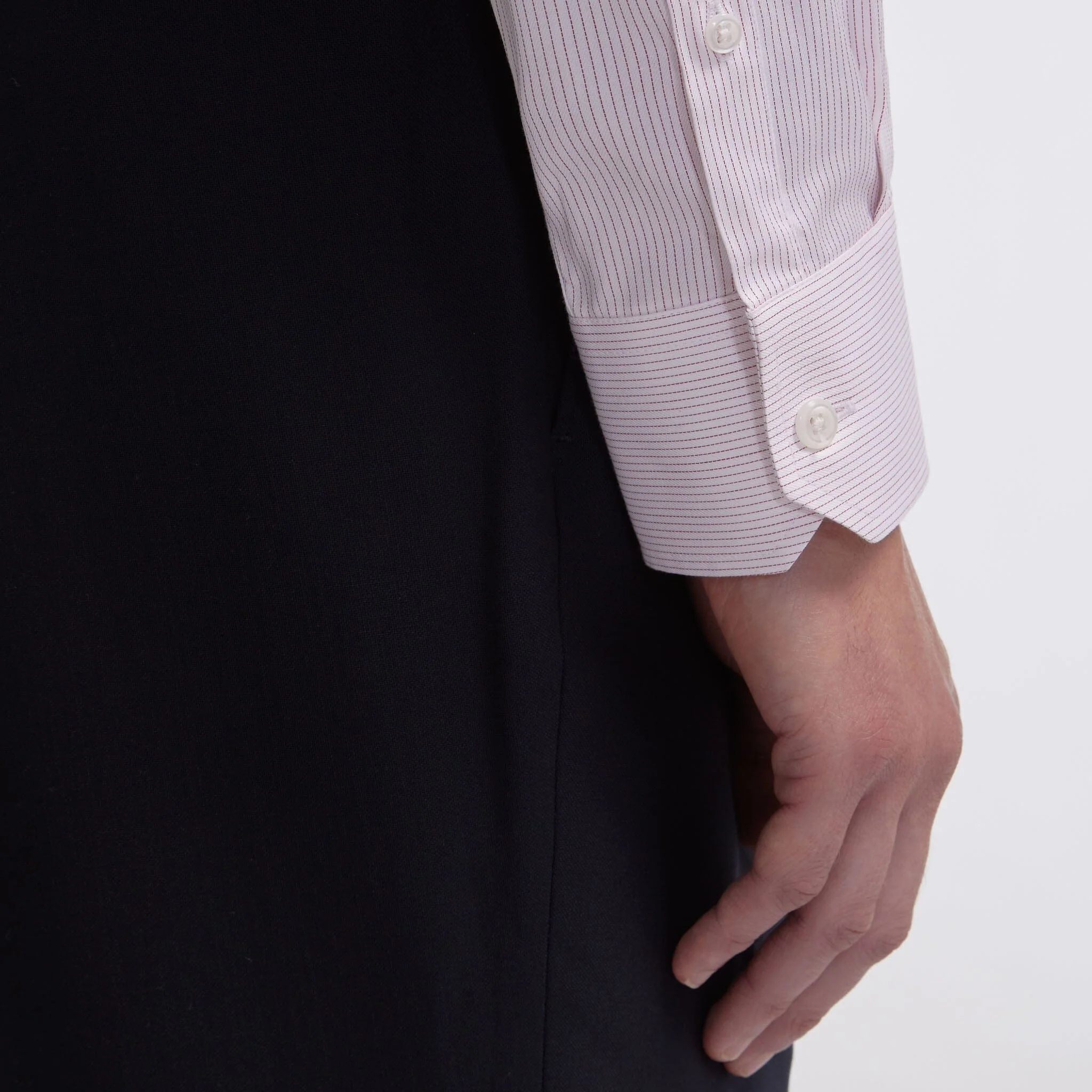Notre chemise en twill 100% coton double retors à fines rayures rouges est parfaite lorsque l’on souhaite ajouter du relief et de la couleur à sa tenue de façon subtile.